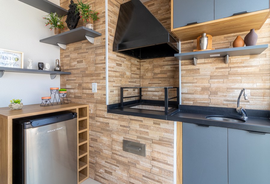 Um dos destaques do apartamento é a integração entre a cozinha e a sala, unindo os ambientes e criando uma área de confraternização.