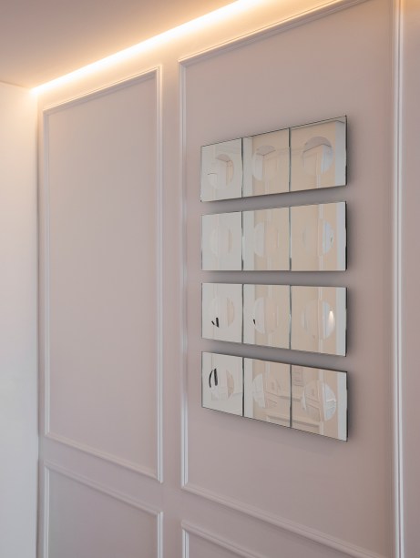 O hall de entrada sóbrio é decorado com uma composição feita a partir de espelhos lapidados e escavados, colocados lado a lado, formando um painel, assinado pela artista Jacqueline Terpins.