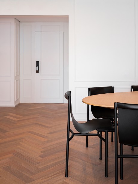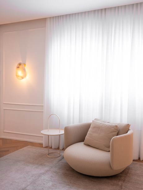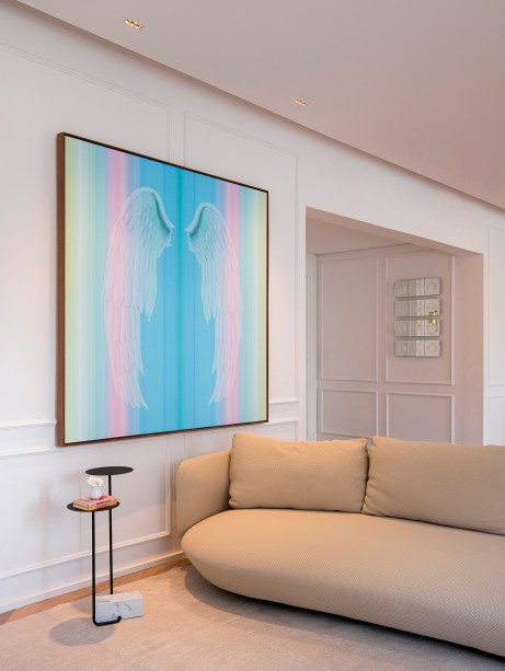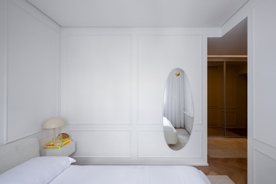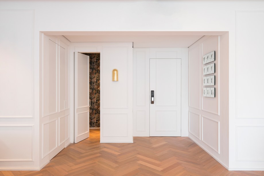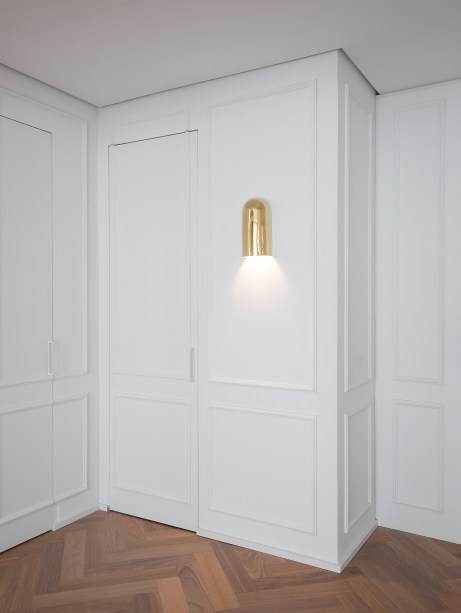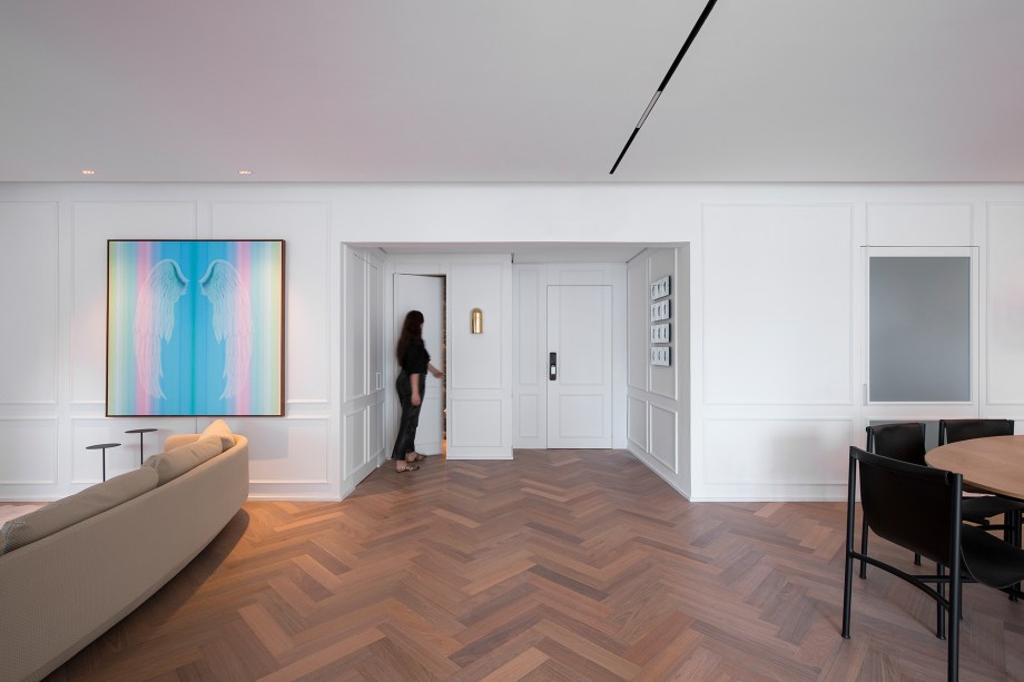 “Concedendo ao espaço um toque minimalista, além da sensação de leveza e de continuidade visual, neste projeto as portas passam praticamente despercebidas em meio às paredes brancas com boiseries” comenta a arquiteta Gabriela Casagrande.