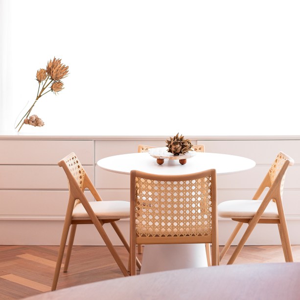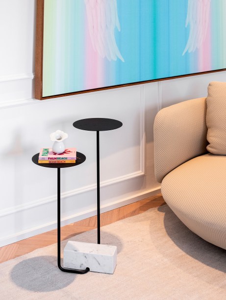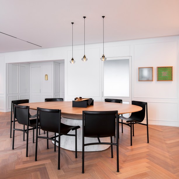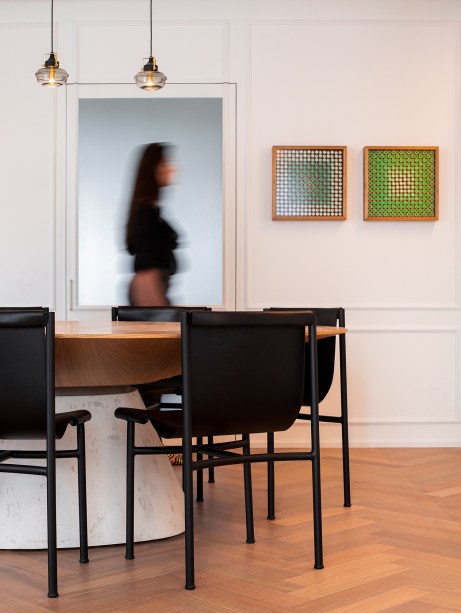O design autoral brasileiro aparece no sofá, poltrona e mesa lateral assinados por Guilherme Wentz. Já a mesa de jantar é de Victor Moreira Leite e as cadeiras são de Jader Almeida.