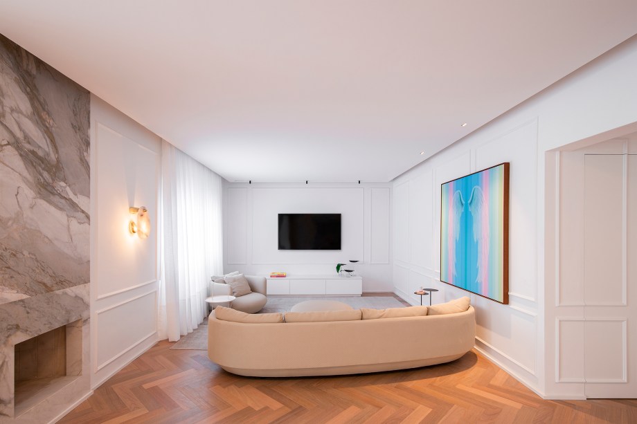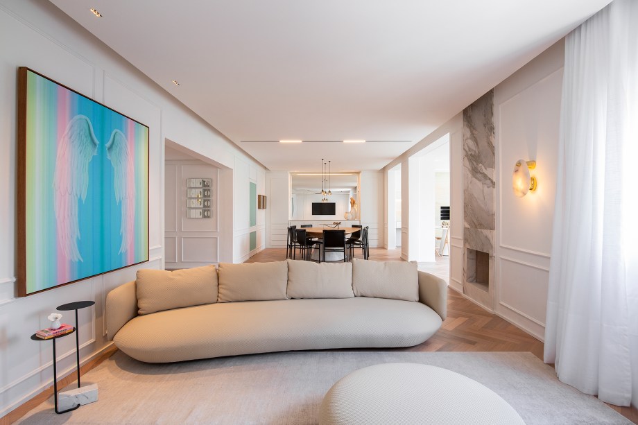 O living espaçoso e confortável ganhou boiseries nas paredes, lareira revestida de mármore, iluminação indireta e uma cortina de linho, que permite a entrada de luz natural.