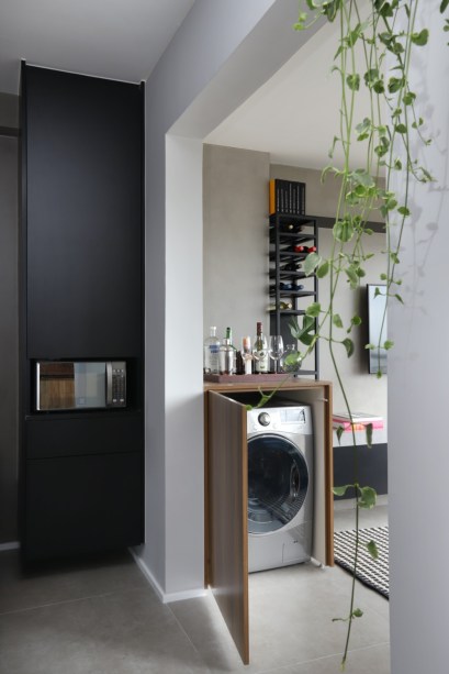 O desejo de ter um bar e adega foi concretizado em uma peça de serralheria, que tem a função de armazenamento de garrafas e taças. Além disso, o móvel que esconde a lava-e-seca serve como apoio para bandeja do bar e todos os seus acessórios. Para atender o outro sonho da moradora, a lareira ecológica, as arquitetas projetaram uma peça portátil com capacidade de aquecimento de até 30 m², na qual ela pode mover confortavelmente para qualquer ambiente do apartamento.