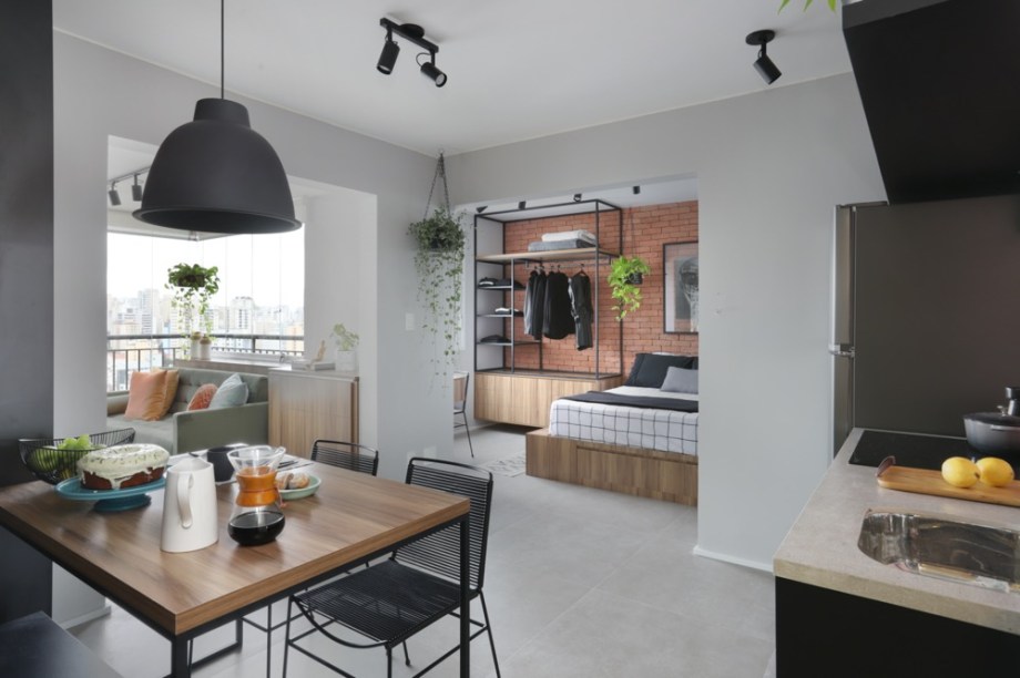 Apartamento de 30 m² com cores escuras e e estilo industrial