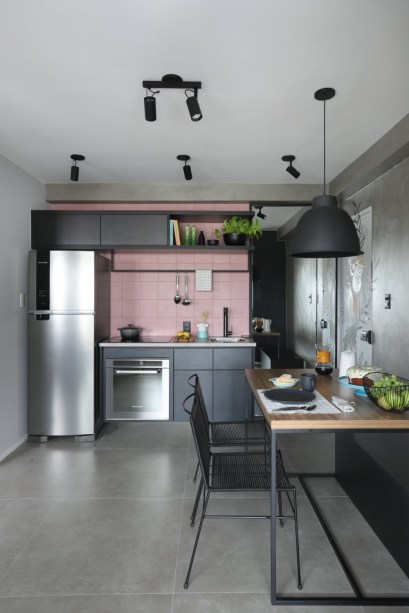 Na cozinha, os armários são estreitos e mesmo sendo de cor escura não pesam no ambiente. A leveza veio também com a bancada de porcelanato e os detalhes de serralheria. E o mix se completa com os azulejos da cor rosa, que trouxe um toque delicado para o espaço.
