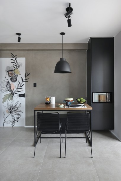 Com base na cor preta e linguagem minimalista, os ambientes não têm muitos armários, o que deixou tudo mais leve. A moradora gosta de armazenar somente itens essenciais para o seu dia a dia. O toque industrial entrou para dar um ar jovem e ousado, que tivesse a ver com sua personalidade.