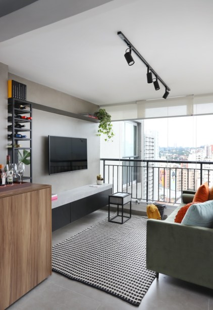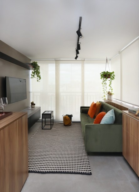 Já a sala foi um dos ambientes que mais trouxe desafios. “Criamos um móvel na parede onde se localiza a televisão para esconder a lava-e-seca, criamos um outro móvel atrás do sofá para enclausurar a condensadora do ar-condicionado e criar um espaço de armazenamento de acessórios de limpeza e, ao lado do sofá, temos uma peça em marcenaria com um tanque embutido”, explicam.
