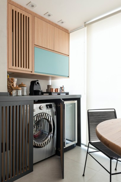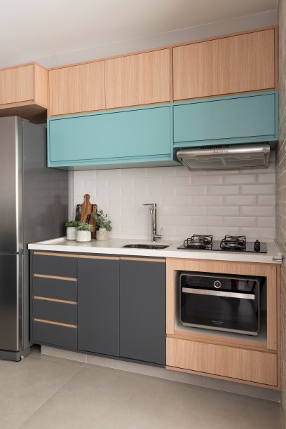 A integração visual também era uma questão importante, já que se trata de um espaço pequeno. Dessa forma, a arquiteta escolheu um único padrão de madeira para toda a marcenaria. Mas, para adicionar alguns toques de cor ao projeto, a cozinha e o móvel da varanda receberam módulos em laca azul e cinza escuro para contrastar com a madeira clara. A cor vem, ainda, nos revestimentos. “Revesti algumas paredes com um azulejo com padrão de tijolo e complementamos a área molhada da pia com azulejos brancos padrão metrô”, explica Livia.