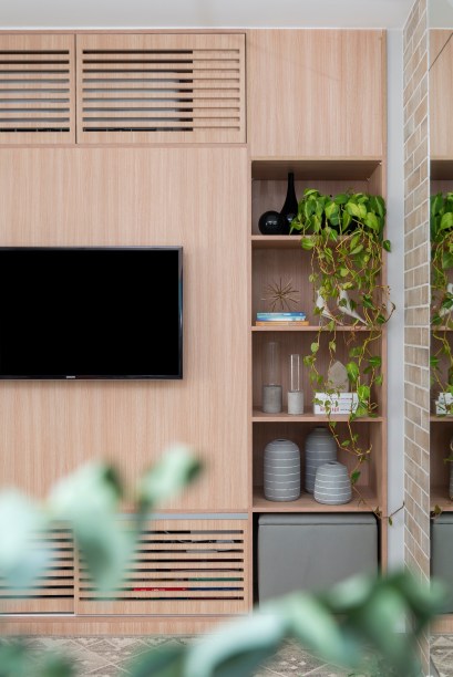 Além disso, para criar todos os espaços necessários e criar sensação de amplitude, Lívia fez algumas mudanças estruturais. “Nivelei a varanda e retirei a porta entre esse ambiente e o living porque era uma área fundamental para a integração dos ambientes e melhor aproveitamento da área”, explica. As bancadas também foram todas demolidas e os revestimentos trocados. A parede que havia entre o living e o dormitório também saiu para dar lugar a um móvel que atende os dois ambientes. E, por fim, foi aberto um nicho na alvenaria do dormitório para instalar um armário para guardar acessórios.
