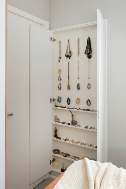 Mas, o maior desafio foi a marcenaria. “Precisávamos de um projeto muito bem pensado que acomodasse não somente muitas roupas e sapatos, mas também louças e outros acessórios de cozinha”, explica a profissional. Assim, todos os cantinhos foram aproveitados e rigorosamente dimensionados para que tudo se encaixasse perfeitamente. A marcenaria também foi usada para camuflar alguns equipamentos do apartamento, como a evaporadora do ar-condicionado, o aquecedor a gás e a lava e seca.