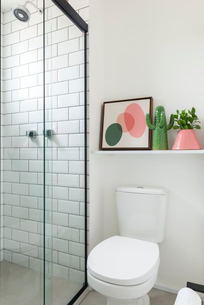 O banheiro foi o único ambiente que rompeu com o padrão da madeira. “Segui apenas com branco, preto e cinza em revestimentos e acabamentos, como o misturador da cuba. Também instalei espelhos na parede lateral deste banheiro e em uma parede do living para trazer mais amplitude aos espaços”, diz.
