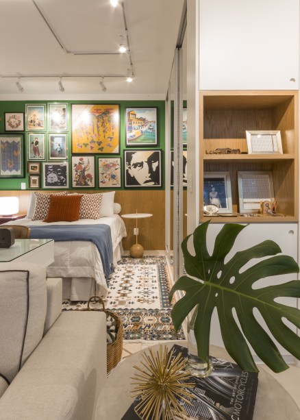 Um dos destaques do décor é a gallery wall, emoldurada pelo verde, na parede da cabeceira. Ali, há quadros pintados pela mãe do morador e tecidos pintados artesanais, típicos da ilha de Okinawa no Japão (local de origem da família do morador), emoldurados. Estas peças fazem parte do apelo afetivo do ambiente. Ainda de Okinawa, há também uma boneca vinda da ilha dentro de caixa de acrílico – tratada como relíquia – que dá boas-vindas aos convidados.