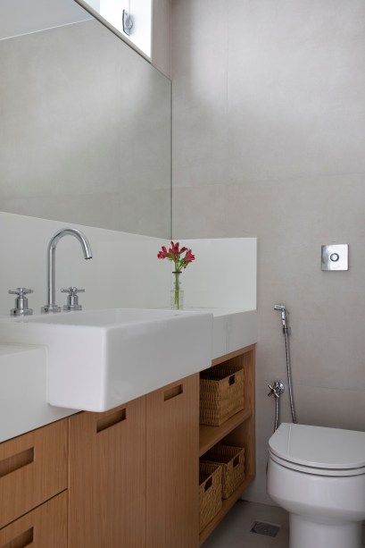 “A cliente queria uma sala maior, com espaço de estar, tv e jantar, além de um quarto só para os netos. E também uma reforma total na cozinha e no banheiro da suíte dela”, explica Marina.