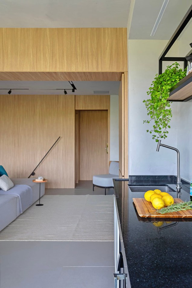 Painéis de madeira foram um recurso bastante utilizado no projeto. Eles aparecem no hall de entrada e também na porta mimetizada que leva à cozinha.
