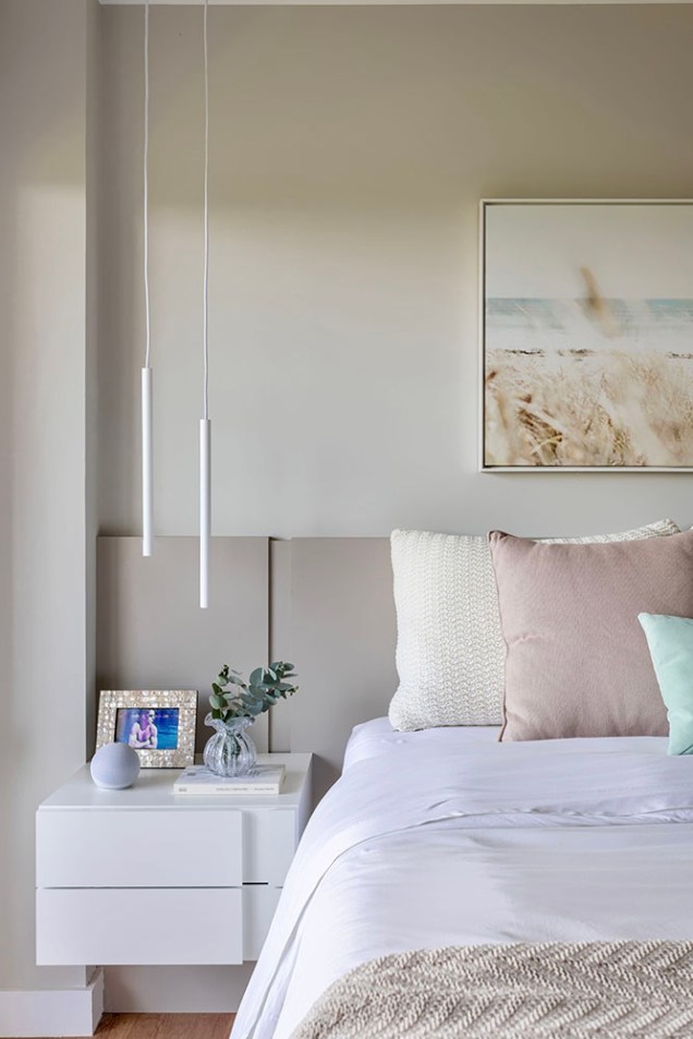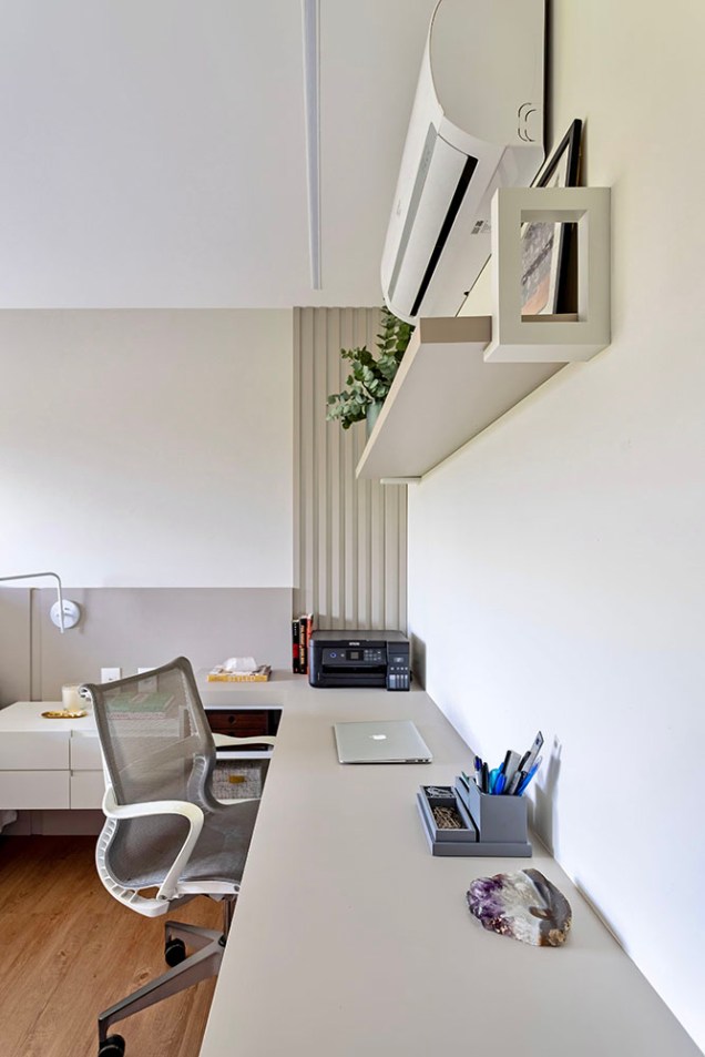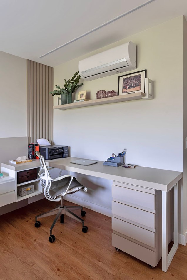 O quarto do casal também recebeu uma bancada, para ser utilizada com home office. Para a decoração, os moradores apresentaram à arquiteta referências em tons de cinza e madeira, além de projetos bem modernos.