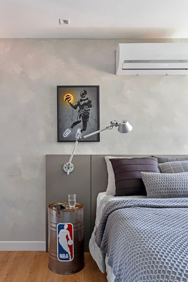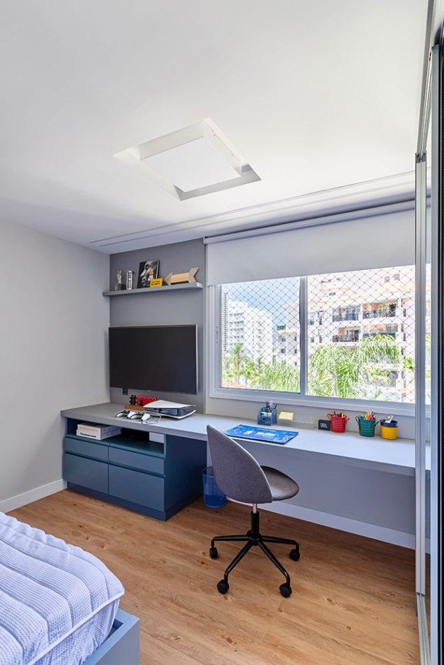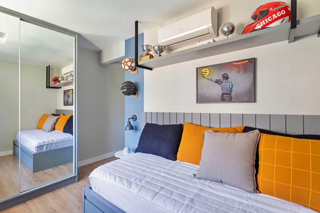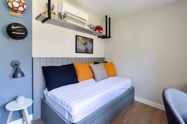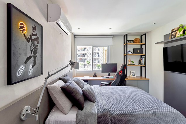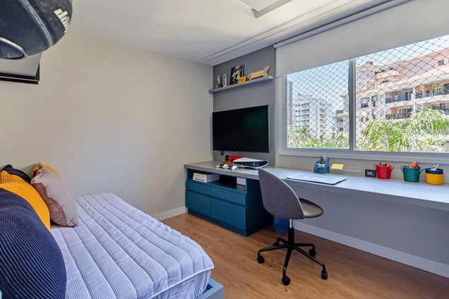 Os quartos dos filhos (um de 8 e um de 13 anos) não eram alterados há 10 anos, então foi preciso atualizá-los. Foi acrescentada uma bancada ampla para estudos e a decoração foi inspirada em basquete, o esporte preferido dos meninos.