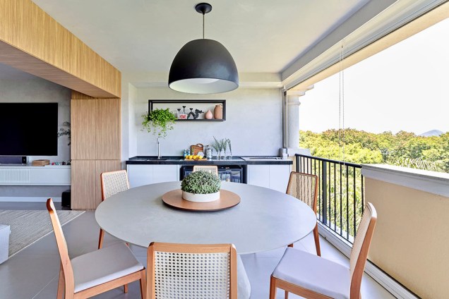 A esquadria que separava a varanda da sala foi eliminada, conectando os ambientes. Para garantir a integração visual, a profissional escolheu um piso de porcelanato cinza para todo o espaço.