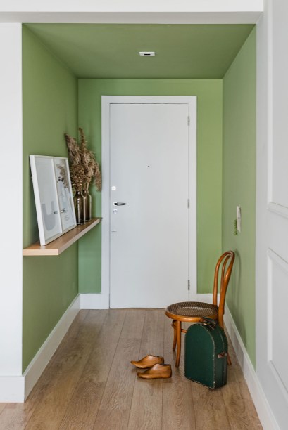 “Optamos por uma base neutra em tons de cinza nas pinturas e marcenaria, pontuando com cores mais vivas no estofamento do sofá e nas obras de arte.” Explica João sobre a paleta de cores escolhida para o projeto. “No hall, ousamos no color block verde, tornando o pequeno espeço diferenciado apenas aplicando a mesma pintura nas paredes e no forro do teto, criando ali um efeito de caixa”, finaliza.