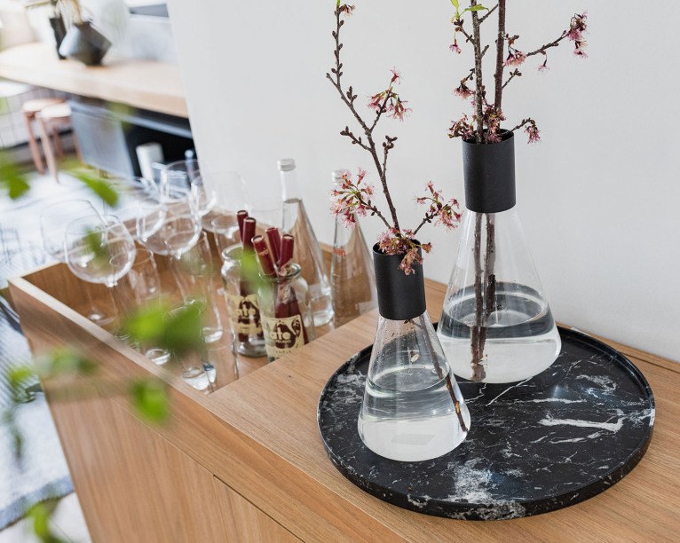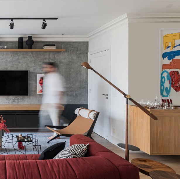 O segundo item da lista de pedidos era um móvel-bar para receber os amigos e que fossem mantidas algumas características originais do imóvel, combinando-as com uma proposta de décor mais despojada. Para isso, o arquiteto desenhou um móvel com função de bar, que foi executado em marcenaria e fixado em uma das paredes na extremidade da sala.