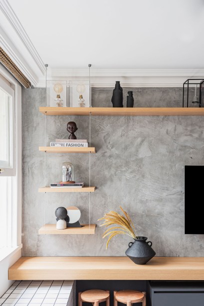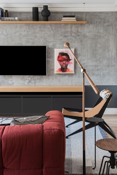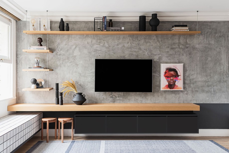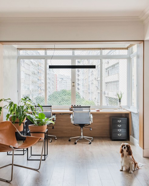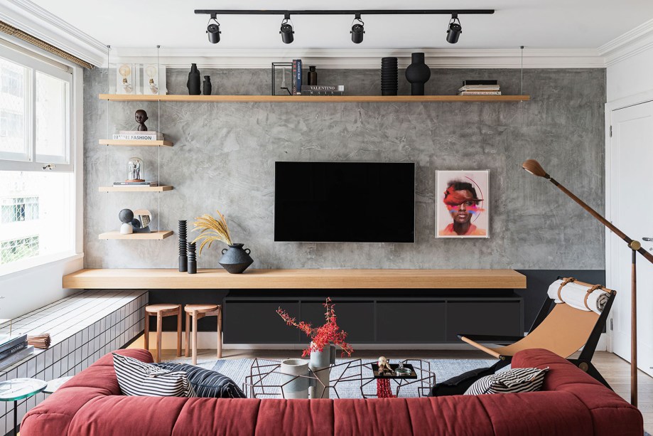 Na lista de pedidos havia apenas duas coisas: um home office que foi criado com uma bancada única de trabalho, que se estende ao longo de uma das janelas da sala, voltada para as copas das árvores. A moldura em marcenaria aplicada em todo o vão delimita a transição dos espaços, assim como a escolha da textura em cimento queimado.