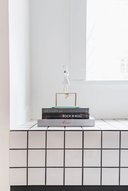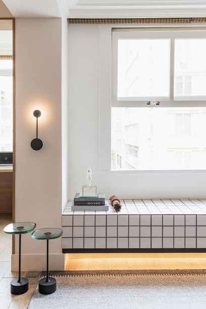 Com a opção de ser iluminado embaixo, o grande banco solto sob a janela da sala de estar foi executado em marcenaria, revestida com ladrilhos brancos de piscina. O projeto é repleto de peças de mobiliário assinadas por designers brasileiros.