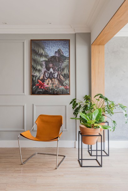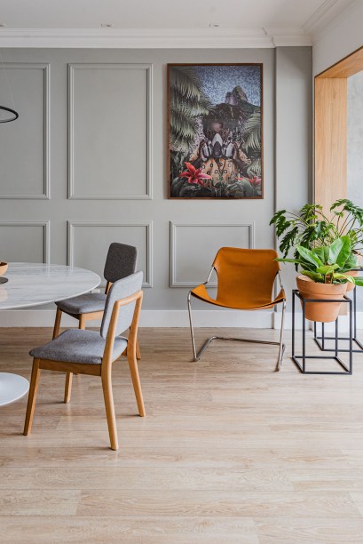 Por ser um imóvel alugado, o arquiteto fez intervenções com iluminação, pinturas e marcenarias pontuais, combinadas com mobiliários de design soltos que podem ser facilmente transportados para um novo endereço. No décor, o projeto combina elementos clássicos (como as boiseries na parede maior da sala e as sancas de gesso no teto) com peças e materiais que remetem ao estilo industrial.
