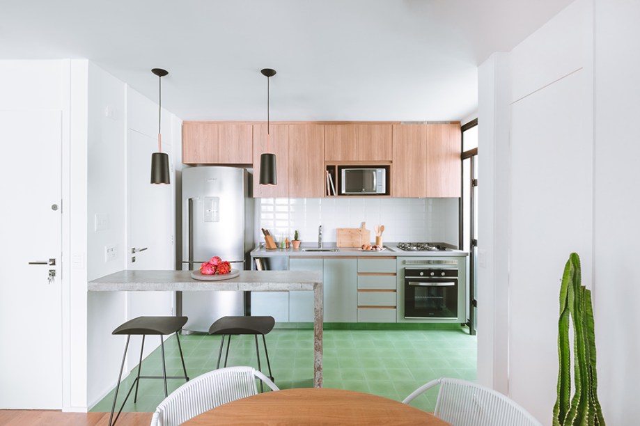As cores estão presentes nos pisos e marcenarias auxiliando na composição dos ambientes da cozinha e dos dois banheiros. Na cozinha, seu piso recebeu um ladrilho hidráulico na cor verde e a marcenaria dividiu-se em MDF fórmica na cor verde pastel. Na parte inferior, MDF em carvalho na parte superior, dialogando com assoalho de madeira da sala. Já os banheiros receberam ladrilhos hidráulicos amarelos no piso e sua marcenaria também em MDF carvalho. Veja mais fotos na galeria abaixo!