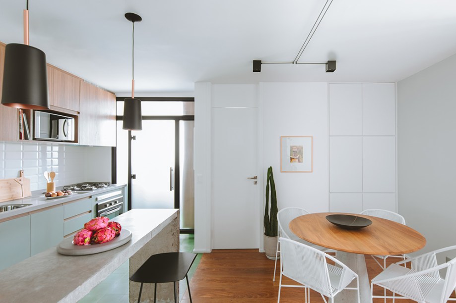 O estar ganhou uma nova cara, mais integrada e ampla. Foi possível aumentar a largura da sala por meio da conexão com a cozinha. A continuidade visual se dá a partir da ilha de concreto vazada e do pilar de concreto descascado, os quais permitem o entendimento de um amplo e único espaço.