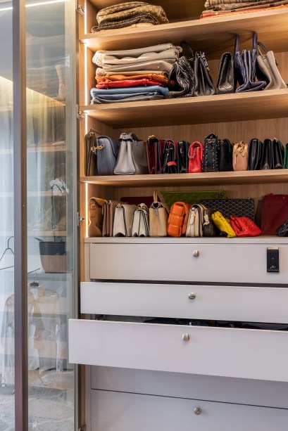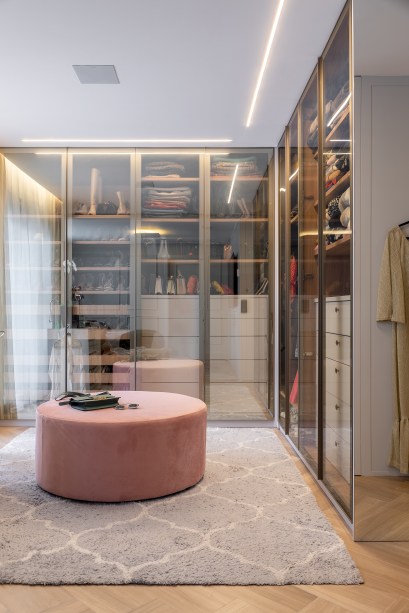 Além da paixão pela arquitetura, a profissional nutre um carinho especial pela moda e, esse foi um dos pontos de partida para a execução do dormitório, que ganhou mais área para acomodar um closet ultramoderno.