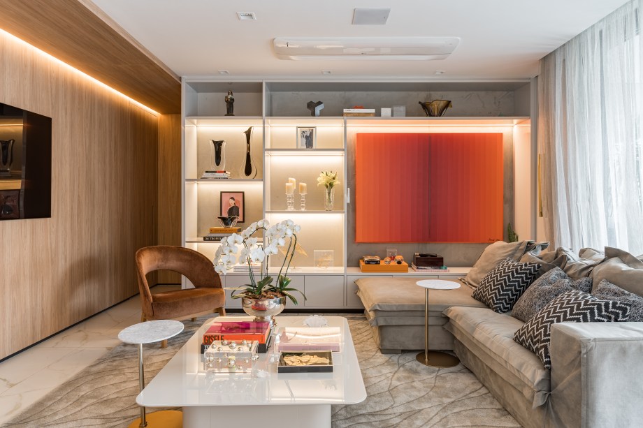 E, além de todo mobiliário escolhido a dedo e pensado para deixar o ambiente aconchegante, o protagonismo da área fica por conta da estante em marcenaria sob medida. Colorida e marcante, a tela em tons de laranja é uma criação cheia de personalidade do artista David José.