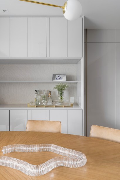 Além da estante, o buffet da sala de jantar também foi executado sob medida, pela SCA Jardim Europa, e exerce também a função de cristaleira para organizar a louça e a prataria. O pendente com esferas foi outra peça escolhida devido ao design moderno e ao efeito sofisticado que agrega ao espaço.
