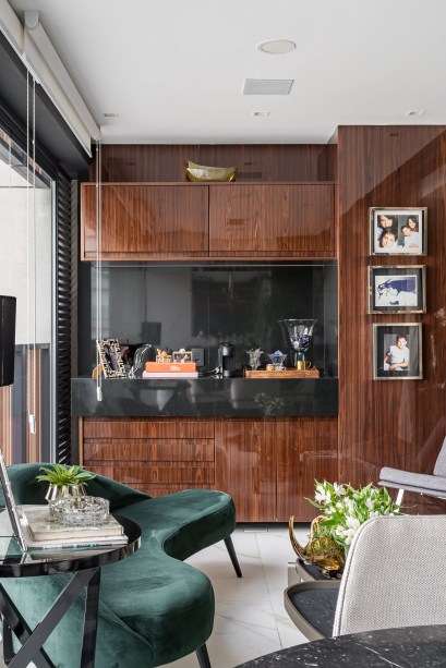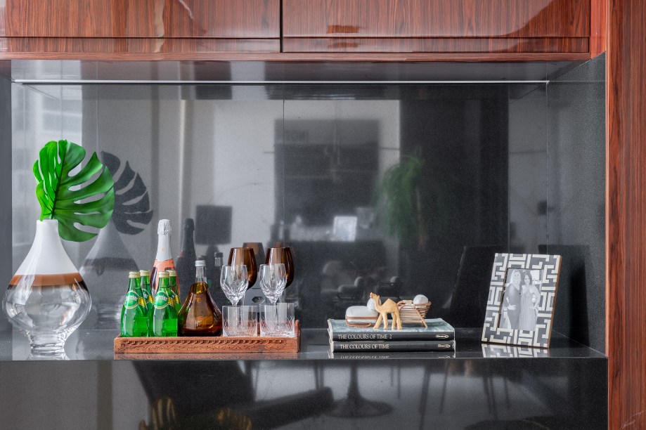 Para o bar, localizado no canto direito da varanda, a marcenaria sob medida, da SCA Jardim Europa, desenhou portas e gavetas que acomodam os utensílios de uso prático. Já a decoração ficou por conta de fotografias com molduras prateadas e um elegante sofá para os momentos de conversa e relaxamento. “Uso muito a varanda para receber os amigos”, revela a arquiteta.