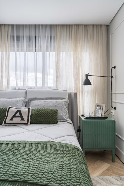 Para as paredes que adornaram o dormitório, a arquitetura foi trabalhada com boiserie, a técnica arquitetônica francesa popular desde o século XVII. “Aqui, usamos molduras de poliestireno branco, que foram pintadas na mesma cor das paredes do quarto, dando movimento e criando um ponto de atenção elegante e, ao mesmo, discreto”, detalha a arquiteta.