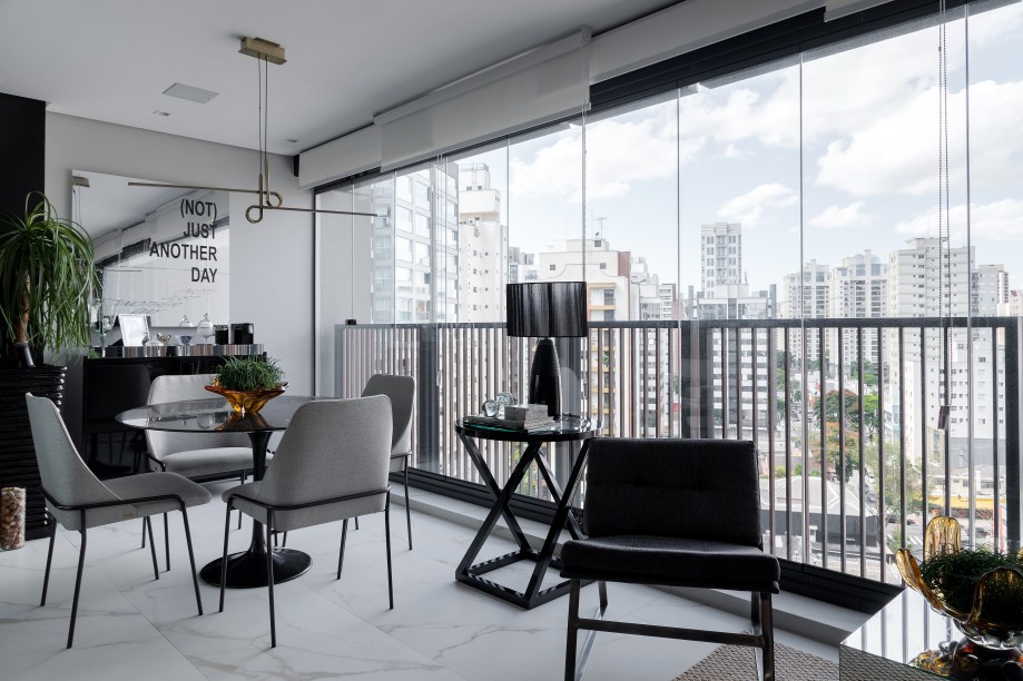 Do lado esquerdo da varanda está localizado o cantinho do café, com um móvel sóbrio para acomodar a cafeteira. Para o décor, a obra “(Not) Just Another Day”, da artista Fernanda Naman, encanta o espaço. Já no controle da luminosidade, foi instalada uma tela solar (Amorim Cortinas) que protege contra a ação dos raios UV, com tramas intermediárias e média transparência.