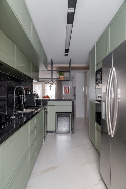 Apê ganha closet walk-in, cozinha verde oliva e banheiro com cromoterapia