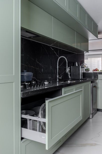 Além do destaque visual exuberante com a marcenaria verde oliva, o cômodo é extremamente prático e traz um acabamento marmorizado para a parede e o piso: os materiais escolhidos são resistentes e de fácil limpeza, sendo eles o granito, para as bancadas e o porcelanato, para o piso.