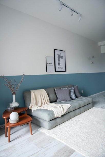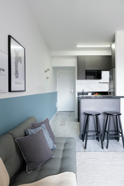 A cozinha básica e essencial ganhou marcenaria revestida de laminado preto, o que garante um visual mais urbano ao apartamento. E, segundo os profissionais, tem tudo o que uma pessoa precisa para passar alguns dias na cidade. A pintura de meia parede no tom azul, que colore a área do estar, deu um charme extra ao ambiente.