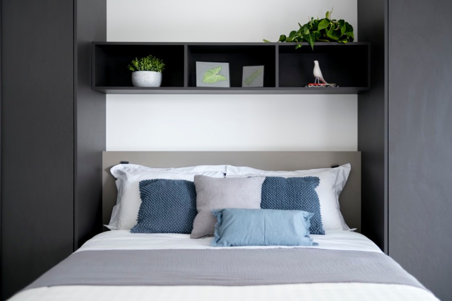 Como a sala e o quarto são integrados, os arquitetos decidiram colocar a TV em uma parede lateral, com suporte articulado. Isso evita a criação de uma divisórias entre os ambientes e garante mais sensação de amplitude. Além disso, permite que o morador temporário possa assistir TV da cama ou do sofá. E para aproveitar cada metro quadrado, os armários foram instalados na lateral da cama, facilitando a organização e servindo de apoio para guardar as roupas e as malas de quem se hospeda.