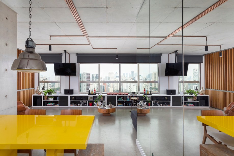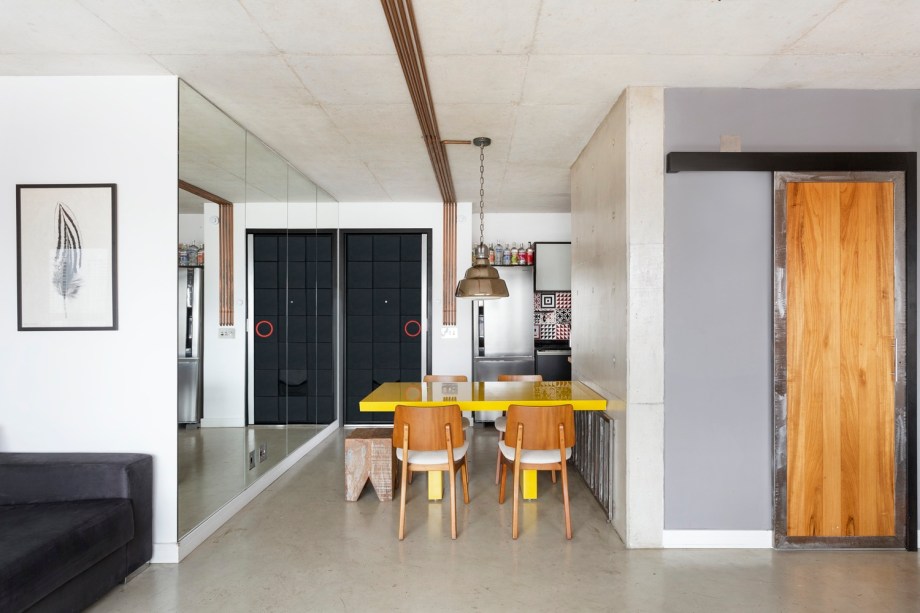 Na sala de jantar, o destaque fica para o lustre da Diesel, feito de vidro soprado metalizado, com detalhes de aço niquelado. Uma cor mais vibrante entra com a mesa amarela, com laca de alto brilho. Uma das paredes foi revestida com placas de concreto e a outra com espelhos para refletir toda a cozinha.