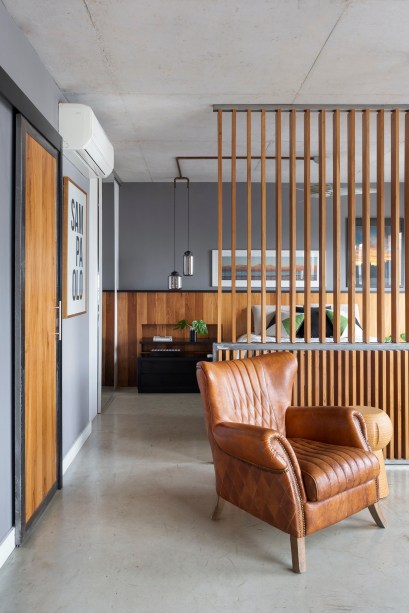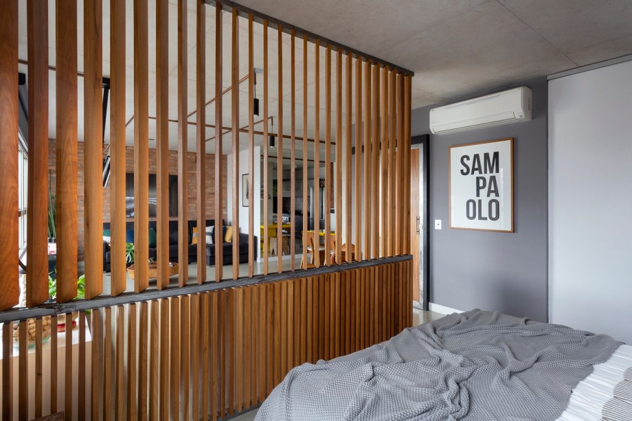 Apesar de todos os ambientes serem integrados, o quarto pode ficar isolado sempre que o morador quiser. Isso, graças ao painel de freijó ripado que abre e fecha, criado por Antonio para demarcar a divisão. “O sistema foi desenvolvido em serralheria e são três peças horizontais, com estrutura de alumínio. Lembra muito um basculante de janela!”, explica.