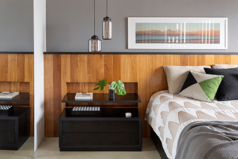 A madeira também marca presença no ambiente, com a cabeceira feita de freijó com filete preto de MDF. A luminária pendente funciona como abajur, liberando espaço nas mesas de cabeceira, e também lembra o estilo industrial, que o morador tanto aprecia.