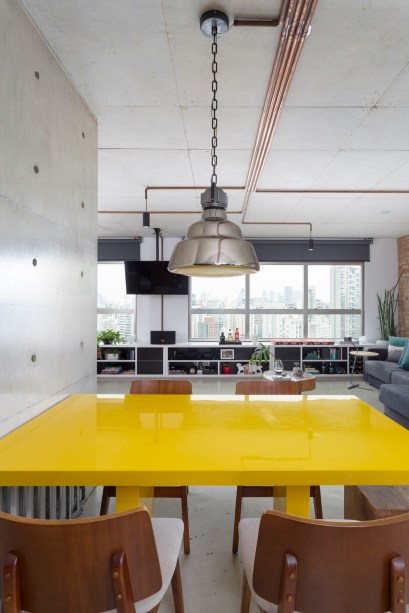 Na sala de jantar, o destaque fica para o lustre da Diesel, feito de vidro soprado metalizado, com detalhes de aço niquelado. Uma cor mais vibrante entra com a mesa amarela, com laca de alto brilho. Uma das paredes foi revestida com placas de concreto e a outra com espelhos para refletir toda a cozinha.