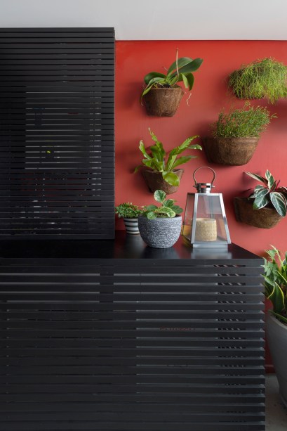 Apesar de todos os ambientes serem integrados, o quarto pode ficar isolado sempre que o morador quiser. Isso, graças ao painel de freijó ripado que abre e fecha, criado por Antonio para demarcar a divisão. “O sistema foi desenvolvido em serralheria e são três peças horizontais, com estrutura de alumínio. Lembra muito um basculante de janela!”, explica.