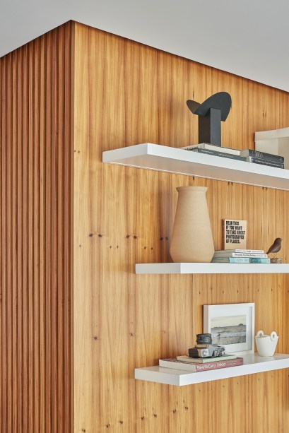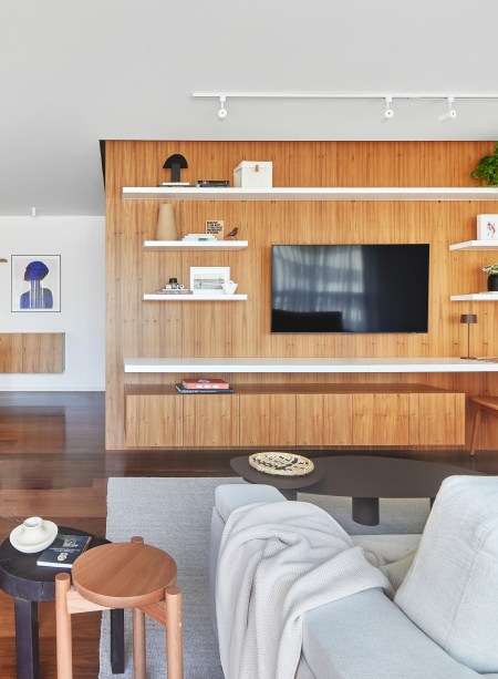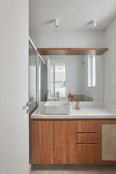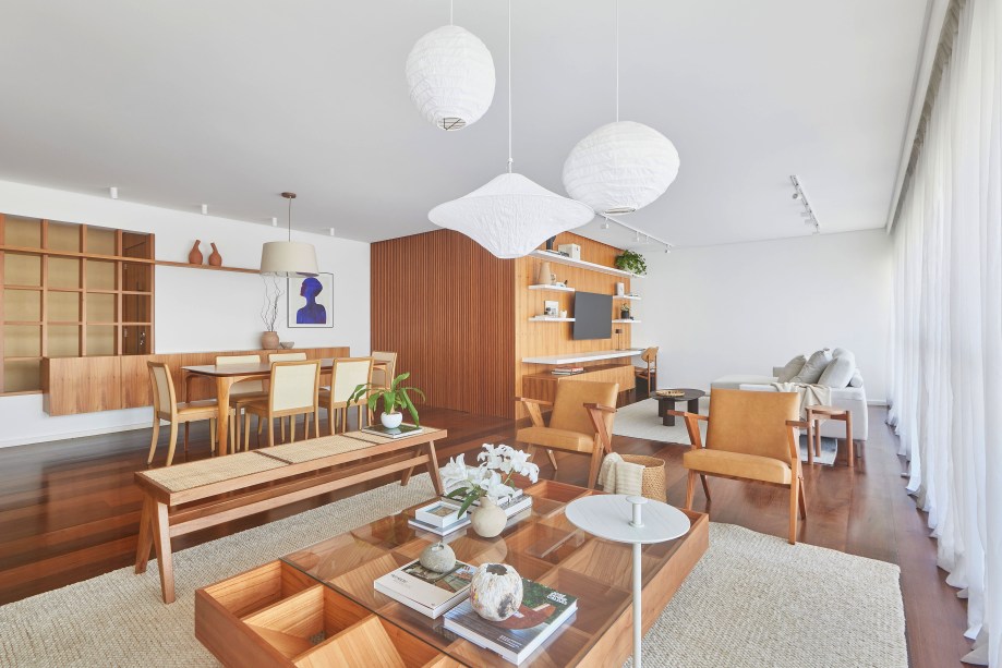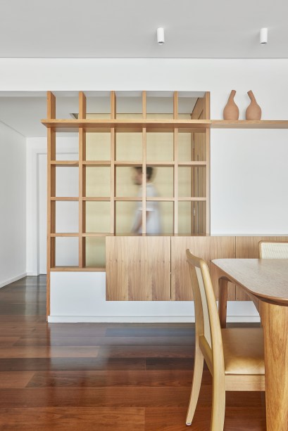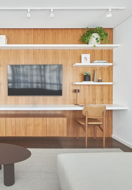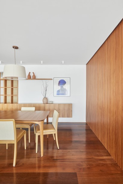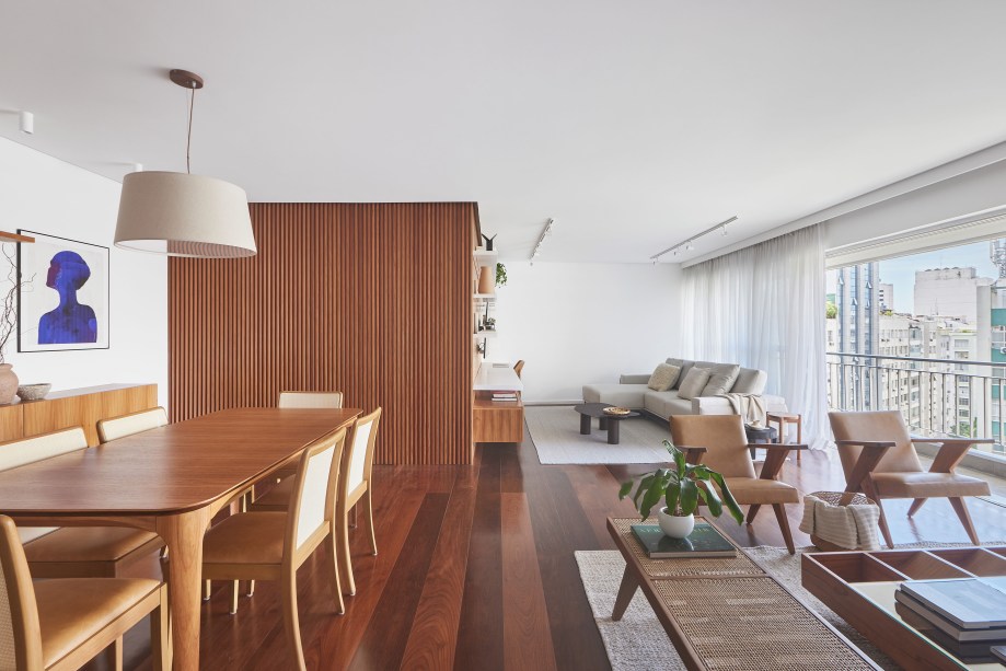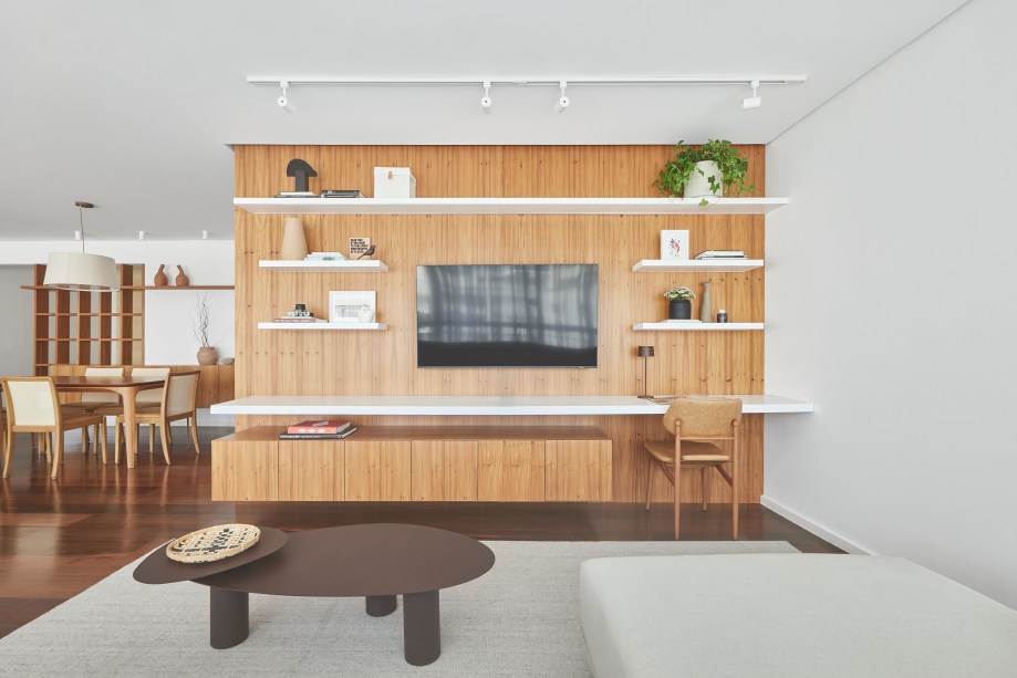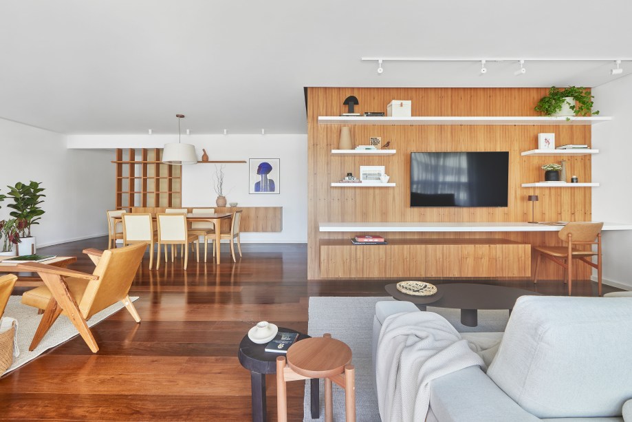 A estante de marcenaria com nichos vazados até o teto, por exemplo, delimita o novo hall de entrada, sem bloquear a luz natural, preservando ainda certa privacidade. Repare ainda que a junção de duas paredes na sala criou um “volume” que o arquiteto revestiu com painel de marcenaria, em folha de peroba natural, com acabamento liso no lado voltado para o ambiente de jantar e ripado no lado voltado para a sala de tv.