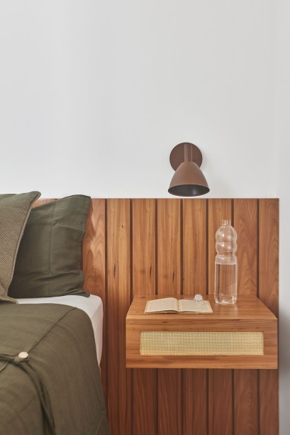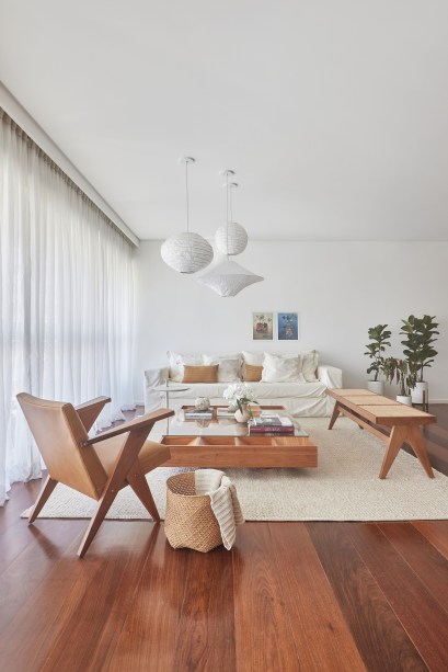 Na decoração, com exceção da mesa e cadeiras de jantar e o sofá da sala de estar, que vieram do apartamento antigo da família, todos os móveis foram comprados prontos ou desenhados pelo escritório e executados em marcenaria, com acabamento em peroba natural. Entre as peças de design assinado, Hugo destaca as poltronas N, do Zanine Caldas, e a mesa de centro Cob, do Frederico Cruz. “A paleta cromática da decoração foi escolhida pelos próprios clientes, que pediram cores sóbrias, em tons claros, para valorizar ainda mais a da madeira”, relata ele.