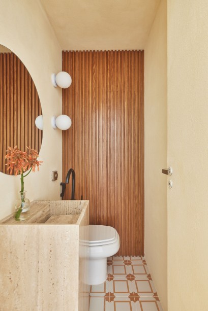 “Como queríamos aspecto mais natural no lavabo, além da coloração areia e terracota, desenhamos uma cuba de piso, que foi executada em mármore travertino”, conclui o arquiteto Hugo Rapizo.