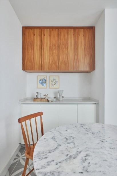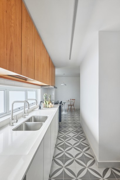 Apê tem piso de ipê na sala e cerâmicas de estampa geométrica na cozinha