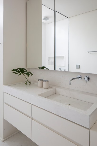 “O apartamento tinha uma suíte e dois dormitórios que dividem um banheiro – um usado como escritório e o outro para receber os sobrinhos que dormem lá algumas vezes. Por conta disso, a moradora optou por um banheiro a mais que dividisse o uso entre receber sobrinhos para dormir e, ao mesmo tempo, ser bonito para receber as visitas e ter cara de lavabo“, contam as arquitetas.
