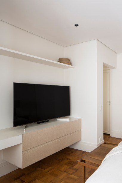 Como o taquinho era uma característica marcante do apê, as arquitetas tiraram proveito dele para fazer uma marcenaria com o mesmo tom, assim destacando-o e contrabalanceando-o com paredes brancas e uma estante leve.