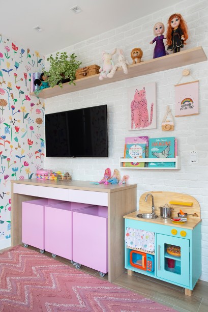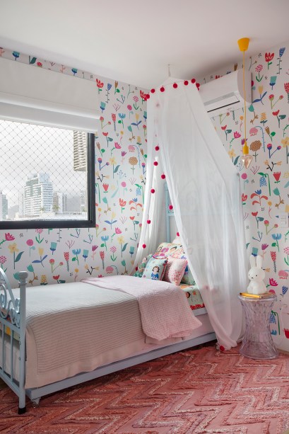 Já no quarto da pequena Duda, duas paredes foram revestidas com um papel de parede super colorido, estampado de flores estilizadas, e as outras duas ganharam um toque mais rústico através de tijolinhos brancos. Já a cama em ferro pintada de azul candy com dossel caindo sobre a cabeceira deixaram o cantinho acolhedor e romântico.