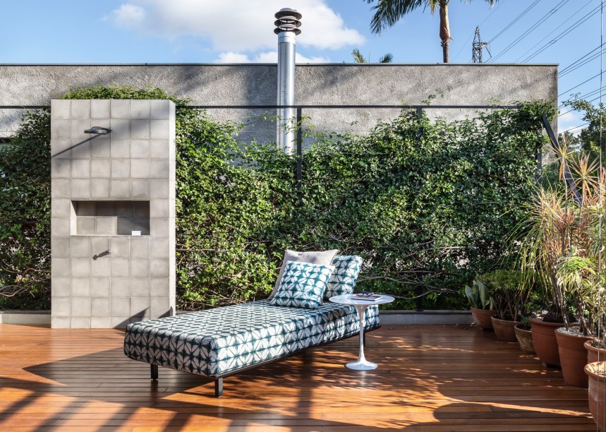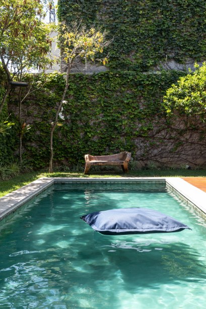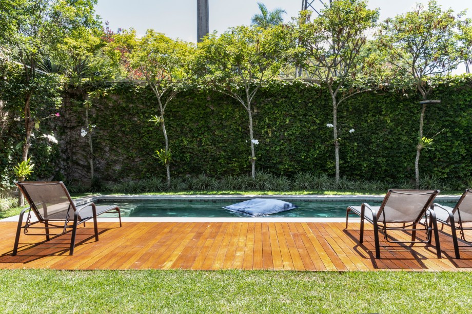 Para ajudar no acesso, uma escada externa de metal preto vai até o gramado entre a piscina e a varanda do térreo. “É um espaço de relaxamento e lazer da própria moradora, onde ela também pode receber os amigos mais íntimos”, pontuou Carolina.